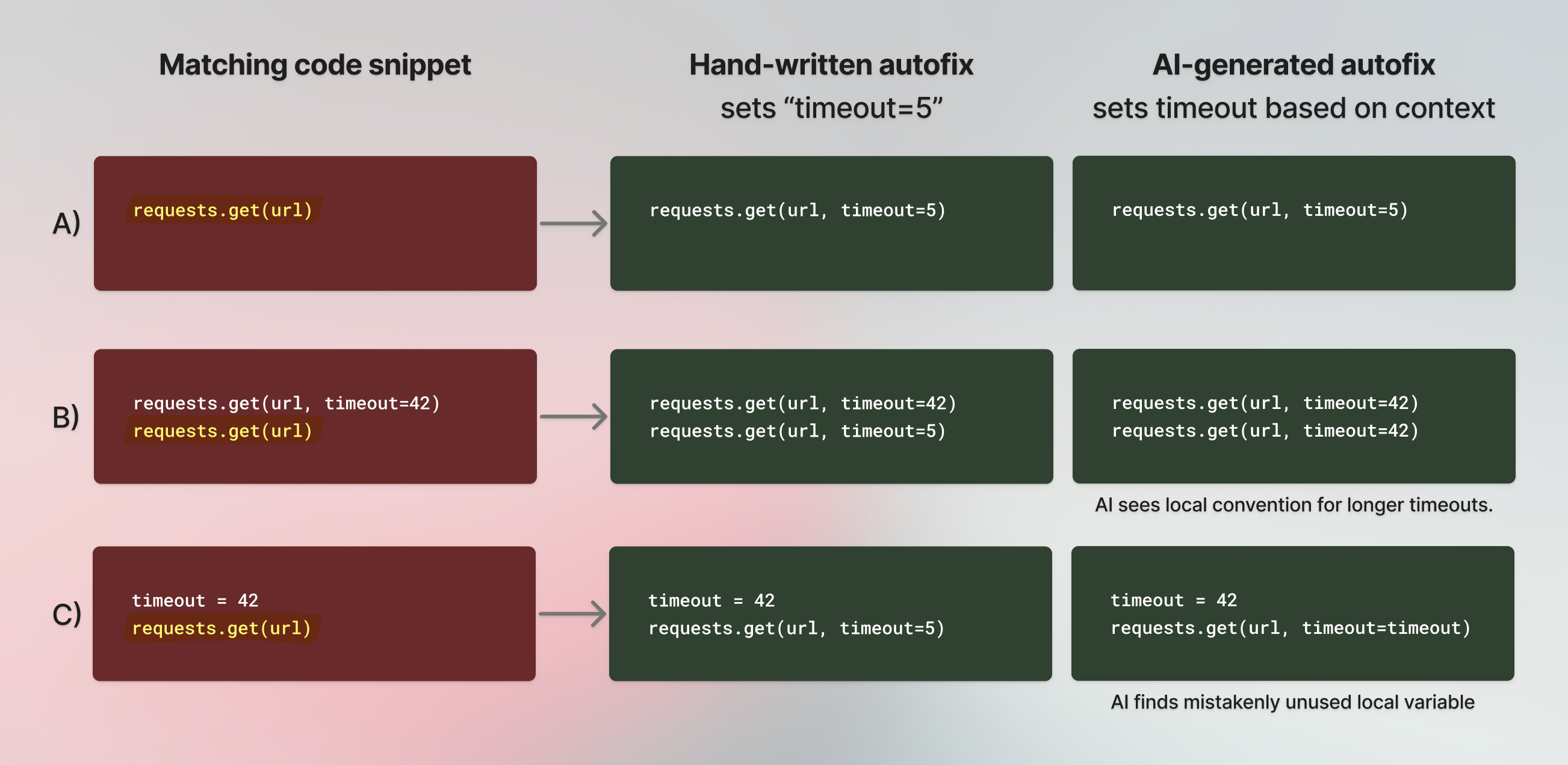 And to make a short-term prediction, thanks to the great performance on coding standards rules, we expect that devs using Semgrep's AI features will write a lot more custom rules. The productivity gain from just having these things fixed for you without needing a discussion is similar to a code auto-formatter, like go fmt or black.