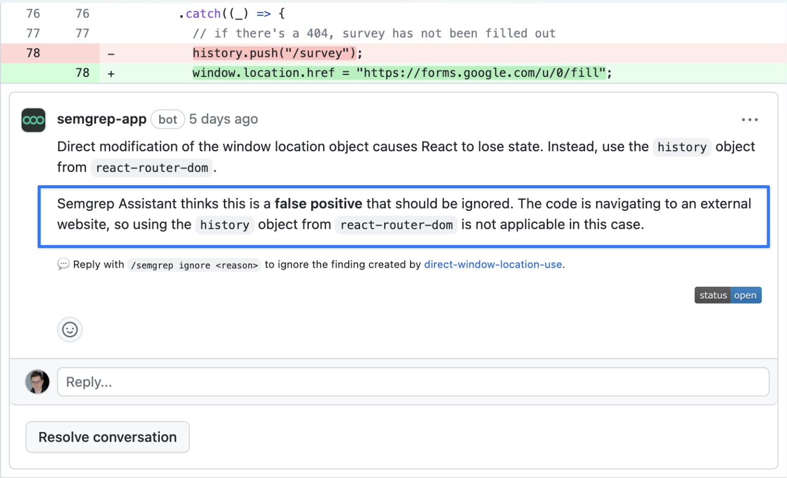 GPT-4 can use its understanding of programming languages and libraries to point out when a finding is just plain wrong and not applicable for a line of code. In the following example, we have an internal custom rule warning devs to use react-router's navigation instead of the browser navigating to switch from page to page. This would normally allow for proper, fast single-page app navigation. But the rule's author forgot to consider that react-router can only navigate to internal URLs on the Semgrep web app, while navigating to other domains is only possible by using the browser. This kind of false positive is particularly prone to confusing developers who themselves might not be familiar with this limitation. GPT-4 however does know, and leaves a useful explanation: