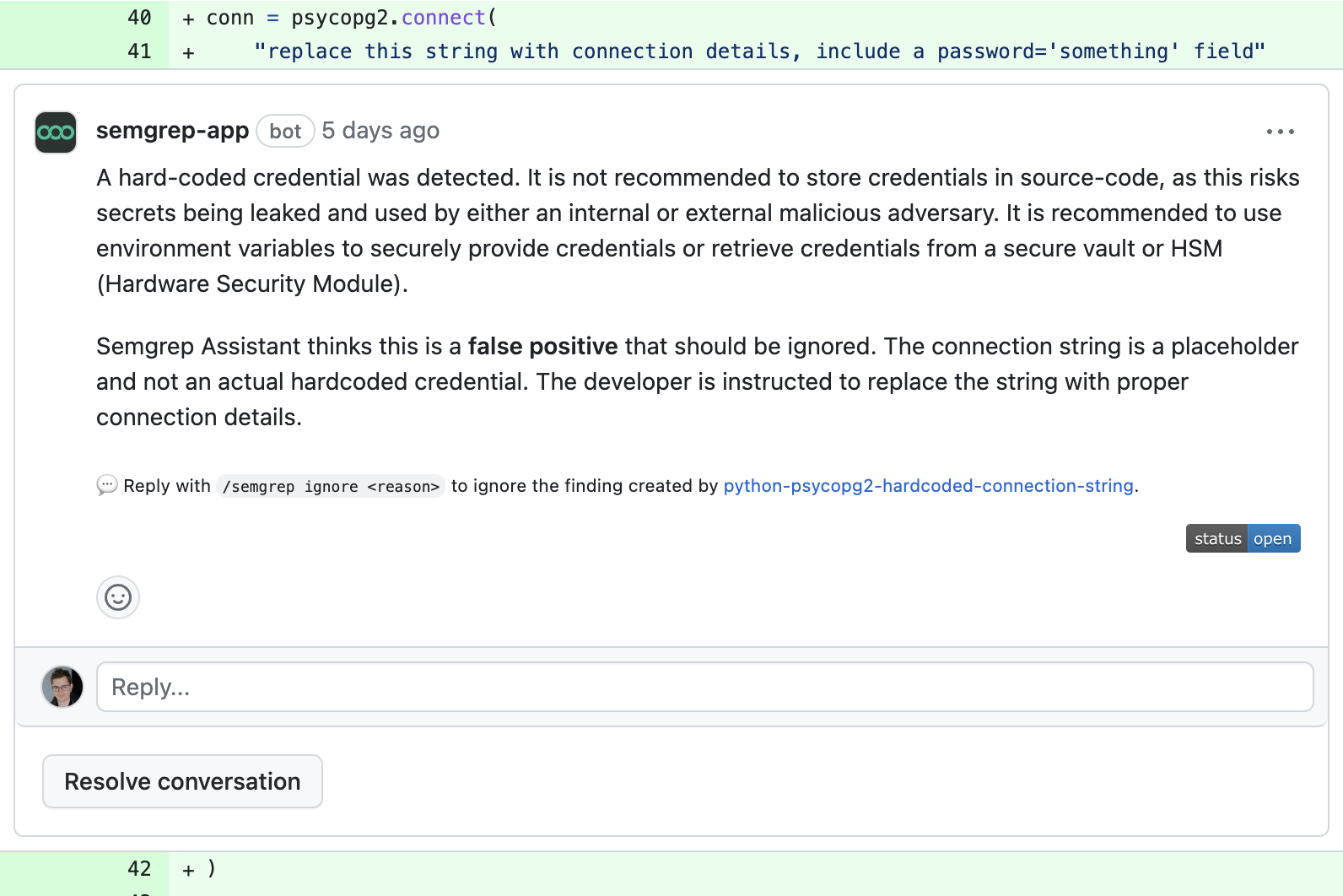 Some of the false positives it can explain are inevitable with a tool that can 'only' pattern match code. For example, to a code parser, an accidentally committed real password is indistinguishable from a deliberate placeholder. GPT-4 however is able to recognize and reason about why such a finding is safe to ignore: